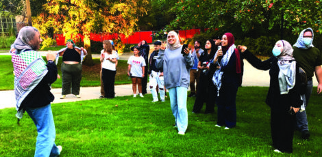 Correspondent photo / Sean Barron A group of Youngstown State University Palestinian students and others staged a small peaceful protest Monday outside of YSU’s DeBartolo Hall. The students took umbrage with the views on Israel’s role in Gaza espoused by Norman J.W. Goda, a Holocaust scholar who spoke at YSU on Monday.