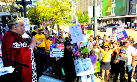 Correspondent photo / Sean Barron Brandon Carrion, an activist from Pennsylvania, in red outfit, plays the role of President Donald Trump during a humorous skit that was part of the “No Kings” protest against the Trump administration in downtown Youngstown on Saturday.