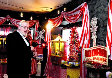 Staff photos / R. Michael Semple William Lawson, executive director of the Mahoning Valley Historical Society, talks about a Christmas scene with an Idora Park theme that is part of the society’s 17th annual “Memories of Christmas Past” exhibit at the Arms Family Museum on Wick Avenue in Youngstown. Last year, the MVHS acquired the collection amassed by Jim and Toni Amey for their Idora Park Experience and this part of the exhibit is in the museum’s solarium.