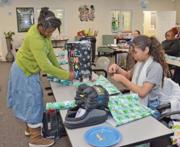 Staff photo / R. Michael Semple Volunteers Ava Jessup-Fields of Youngstown, left, and her daughter Imani Jessup-Fields, 16, wrap Christmas gifts for seniors at Home Instead in Austintown Friday afternoon.