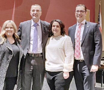 Staff photo / J.T. Whitehouse Following a ceremonial swearing in at Wednesday’s Canfield Board of Education meeting, Mahoning County Probate Judge Robert Rusu, second from left, poses with new Canfield Board of Education members Katie Elford and Jill DeRamo, and returning member Nader Atway.