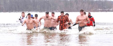 Correspondent photos / John Patrick Gatta After submerging themselves into the water, members of the Sigma Tau Gamma fraternity from Youngstown State University exit Mosquito Lake during Saturday’s Polar Plunge. The fraternity members have been doing the plunge for many years.