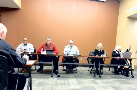 Staff photo / J.T. Whitehouse Cardinal Joint Fire District board members, from left, Richard Russo, Gary DiTullio, Dave Knarr, Christine Oliver and Marie Cartwright hear a report from fire Chief Don Hutchison about two part-timers attending a paramedic course at Mahoning County Career & Technical Center.