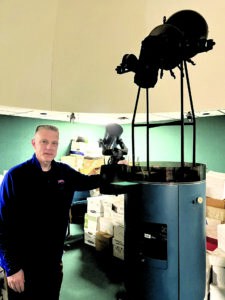 Staff photo / Bob Coupland Lordstown Superintendent Greg Bonamase stands next to a large projector in the high school’s former planetarium, which he hopes to have reopened next school year. It was last used in 2000. Work has begun cleaning the room and getting ready for new equipment.