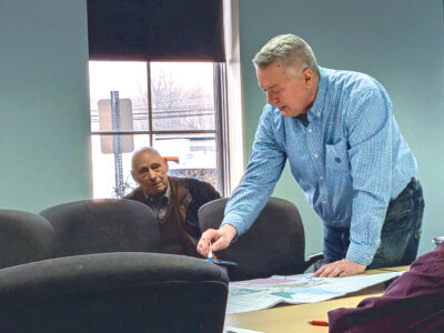 Staff photo / Brandon Cantwell Trumbull County Sanitary Engineer Gary Newbrough, standing, looks at a map showing the different water districts in Trumbull County as Commissioner Tony Bernard looks on. The 12-person Water Advisory Panel had a special hour-long meeting at Newbrough’s office that focused on a regional approach to water supply.