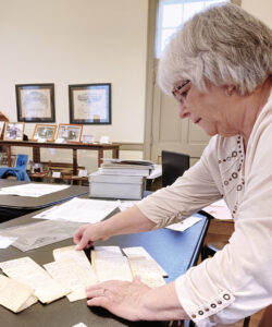 Staff photo / J.T. Whitehouse Poland Historical Society President Laurie Fox constantly reviews historical documents at the Little Red Schoolhouse but is hoping to see new documents soon in the form of scholarship applications.