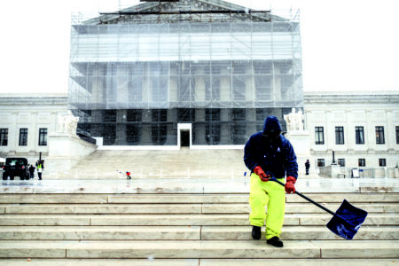 A worker shovels snow and ice in front of the Supreme Court building during the first snowfall of the winter season on Friday, Dec. 5, 2025, in Washington. (AP Photo/Mark Schiefelbein)