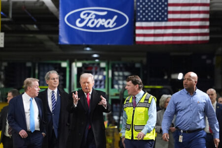 Trump visited the factory floor of a Ford plant in Dearborn, where he viewed F-150s — the bestselling domestic vehicle in the U.S. — at various stages of production. That included seeing how gas and hybrid models were built, as well as the all-gas Raptor model, designed for off-road use.