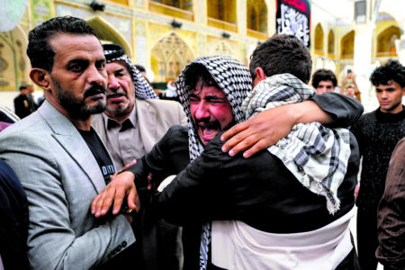 Relatives grieve an Iraqi soldier killed in a strike Wednesday on a military clinic in western Iraq's Anbar province, during a mass procession inside the shrine of Imam Ali in Najaf, Iraq, Thursday, March 26, 2026. (AP Photo/Anmar Khalil)