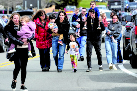 Law enforcement escort families with children away from the Temple Israel synagogue Thursday, March 12, 2026, in West Bloomfield Township, Mich. (AP Photo/Paul Sancya)