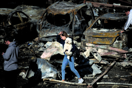 A woman holds her dog as she walks past burned cars a day after an Israeli airstrike in Beirut, Lebanon, Thursday, April 9, 2026. (AP Photo/Emilio Morenatti)