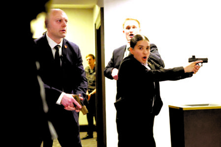 “Out of the way, sir!” someone yelled. Others yelled to duck. From one corner, a “God Bless America” chant began as the president was escorted offstage. Outside the hotel, members of the National Guard and other authorities flooded the area as helicopters circled overhead.