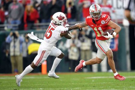 AP. Ohio State wide receiver Jaxon Smith-Njigba runs next to Utah cornerback Malone Mataele (15) during the first half in the Rose Bowl last season in Pasadena, Calif.