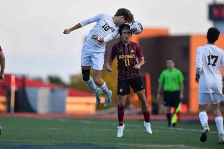 Correspondent photo / Robert Hayes Cardinal Mooney’s Aidan Hryb (11) and Howland’s Jak Kenney (18) battle for a head ball Wednesday evening at Youngstown State’s Farmer National Bank Field. In its 1-0 win, Cardinal Mooney broke a 5-year scoring drought against Howland to improve to 3-2 this season.