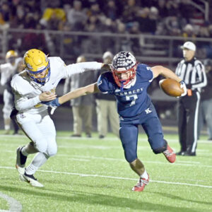 Staff photo / Brian Yauger. Warren JFK's Aidan Rossi breaks a tackle during the Eagles' win over Southern Local.