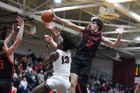 Correspondent photo / Robert Hayes Boardman’s Demarr Clark has a shot blocked by Canfield’s Jake Schneider during the first half of their matchup Tuesday evening. Canfield won 49-34, recording its first victory over the Spartans since 2018.