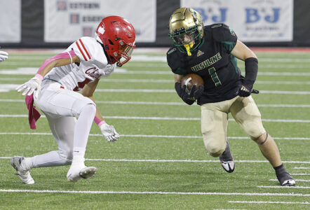 Correspondent photo / Michael G. Taylor Ursuline’s CJ Leombruno braces for contact from a Chaney defender.