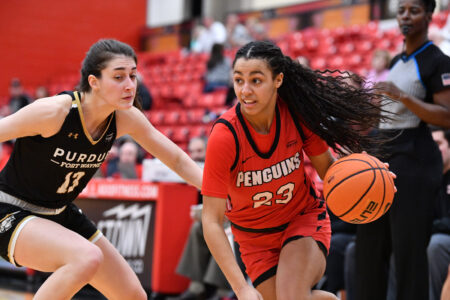 Correspondent photo / Robert Hayes. Youngstown State guard Haley Thierry drives the ball into the lane against a defender during the Penguins’ win over Purdue Fort Wayne on Jan. 18 at the Beeghly Center.