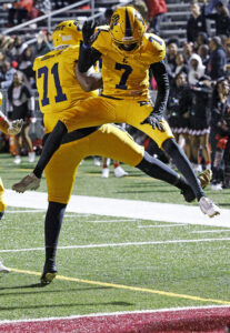 Correspondent file photo / Michael G. Taylor Lamar Claytor (7) celebrates a touchdown with teammate Jemeir Blair (71) against Chaney on Oct. 25.
