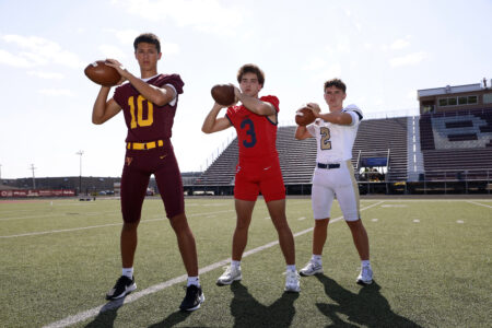 Correspondent photo / Michael G. Taylor South Range quarterback Nick Toy, Austintown Fitch quarterback Collin Kalaher and Lowellville quarterback Ricky Willrich stand with a ball at Boardman’s Spartan Stadium.
