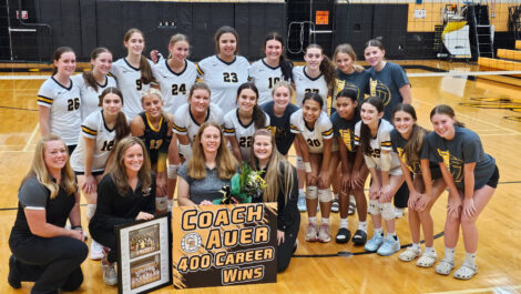 Submitted photo The Crestview volleyball team takes a photo with head coach Alisha Auer, first row and third from left, after she recorded her 400th career victory on Tuesday.