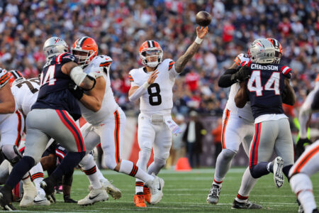 Cleveland Browns quarterback Dillon Gabriel passes against the New England Patriots during an NFL football game at Gillette Stadium, Sunday, Oct. 26, 2025 in Foxborough, Mass. (Winslow Townson/AP Images for Panini)