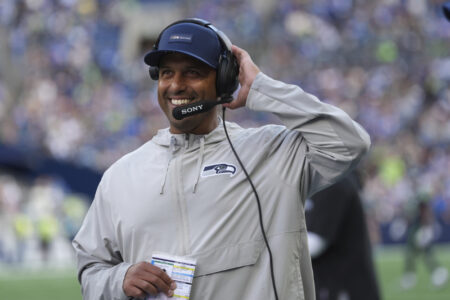 Seattle Seahawks defensive coordinator Aden Durde smiles on the sideline during an NFL football game against the New Orleans Saints, Sunday, Sept. 21, 2025, in Seattle. (AP Photo/Lindsey Wasson)