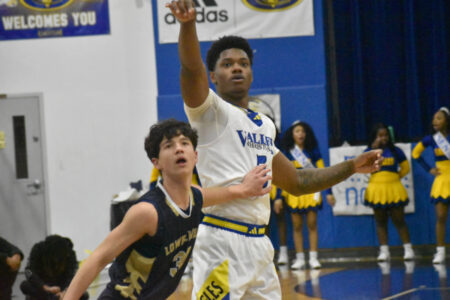 Staff photo / Preston Byers Valley Christian’s Deion Miller, right, and Lowellville’s Jaden Coon watch Miller’s shot during Friday’s game in Youngstown.