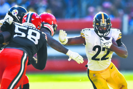 Pittsburgh Steelers running back Najee Harris (22) rushes against the Cleveland Browns during the second half of an NFL football game, Sunday, Oct. 31, 2021, in Cleveland. (AP Photo/David Richard)