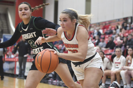 Correspondent file photo / Robert Hayes Youngstown State guard Paige Shy drives to the basket during a game against Wright State last season. The Penguins open the 2023-24 campaign Wednesday against Xavier.