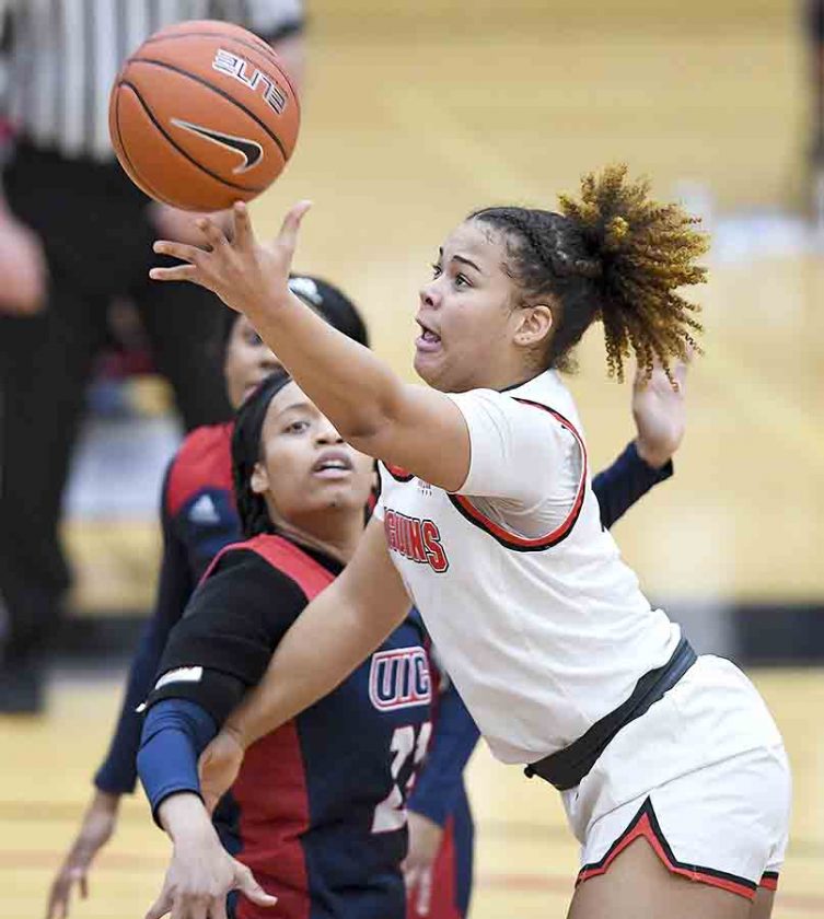 Correspondent photo / Robert Hayes YSU senior Mary Dunn passes outside under the basket during the first half against UIC, she had 14 in the victory.