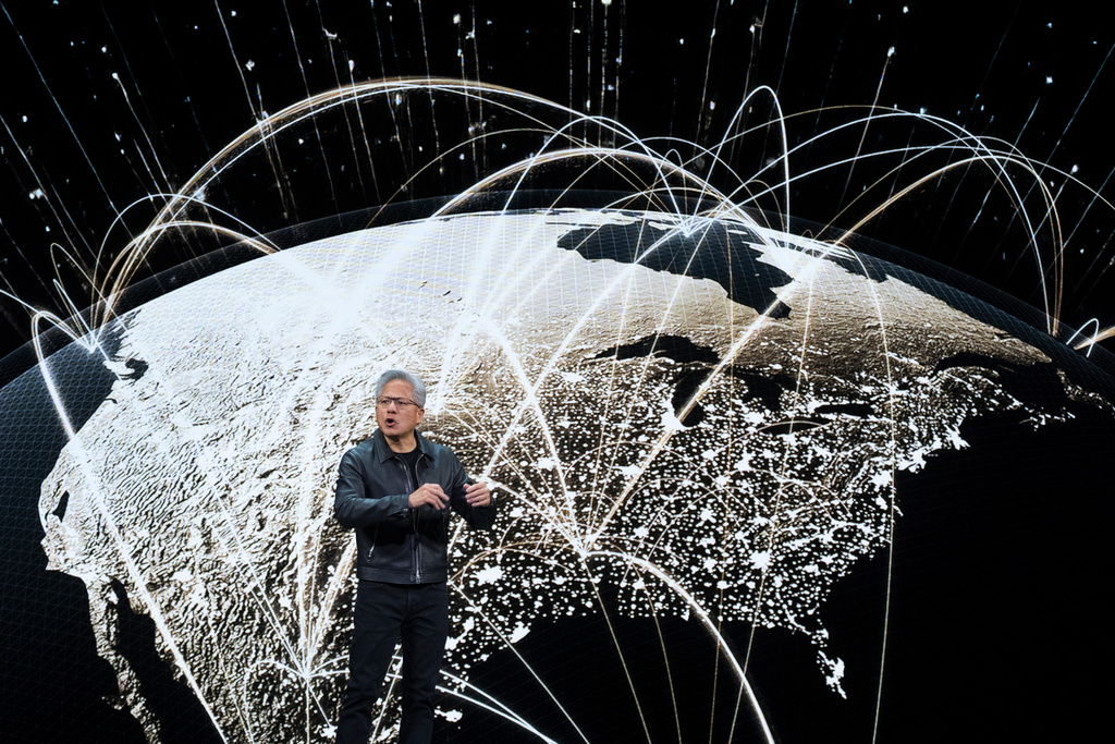 NVIDIA CEO Jensen Huang speaks on how AI infrastructure and AI factories that generate intelligence at scale are powering a new industrial revolution, at Washington Convention Center, Tuesday, Oct. 28, 2025, in Washington. (AP Photo/Manuel Balce Ceneta)